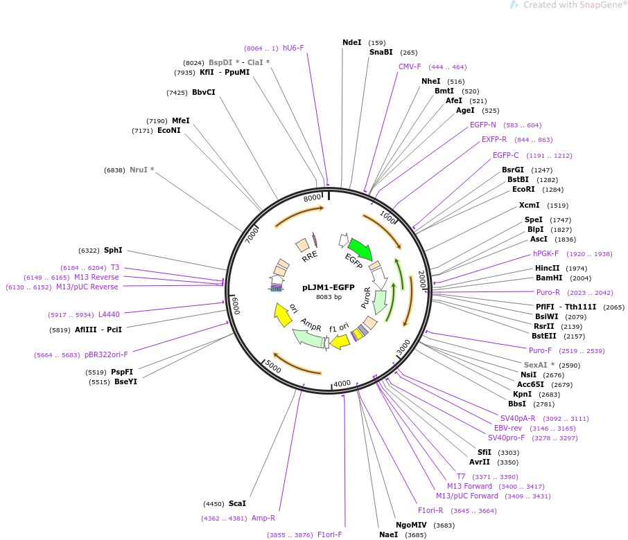 质粒名称:pLJM1-EGFP 质粒编号:19319 质粒备注: (Empty Backbone) 3rd gen lentiviral vector for EGFP fusion; PGK driven puromycin 载体名称:pLJM1 载体类型:哺乳动物表达,慢病毒 筛选标记:嘌呤霉素 原核抗性:氨苄青霉素,100μg/mL 培养温度:37℃ 克隆菌株:Stbl3 高拷贝/低拷贝:高拷贝 插入基因:none 克隆方法:限制性内切酶 5'克隆位点:unknown (not destroyed) 3'克隆位点:unknown (not destroyed) 5'测序引物:CMV-F 质粒图谱: