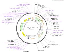 质粒名称:pLKO.1 GFP shRNA 质粒编号:30323 载体名称:pLKO.1 puro 载体大小:7000 载体类型:Mammalian Expression, Lentiviral, RNAi 筛选标记:嘌呤霉素 原核抗性:氨苄青霉素,100μg/mL 培养温度:37℃ 克隆菌株:Stbl3 高拷贝/低拷贝:高拷贝 插入基因:GFP shRNA 基因别名:shGFP 克隆方法:限制性内切酶 5'克隆位点:AgeI (destroyed during cloning) 3'克隆位点:EcoRI (not destroyed) 5'测序引物:LKO.1 5' 质粒图谱: