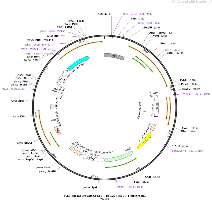 质粒名称:pLL3.7m-mTurquoise2-SLBP(18-126)-IRES-H1-mMaroon1 质粒编号:83842 质粒备注: Fluorescent probe for S/G2 cell cycle transition and G2/M transition 载体名称:pLL3.7m 载体大小:6500 完整质粒大小:9434 载体类型:哺乳动物表达,慢病毒 原核抗性:氨苄青霉素,100μg/mL 培养温度:37℃ 克隆菌株:NEB Stable 高拷贝/低拷贝:高拷贝 插入基因:mTurquoise2-SLBP(18-126)-IRES-H1-mMaroon1 物种来源:H. sapiens (human), Synthetic 插入大小:3043 基因名称:SLBP (a.k.a. HBP) 启动子:CMV 克隆方法:限制性内切酶 5'克隆位点:NheI (not destroyed) 3'克隆位点:EcoRI (not destroyed) 5'测序引物:agctggtttagtgaaccgtcagatc 3'测序引物:ggaaccggaacccttaaaca 质粒图谱: