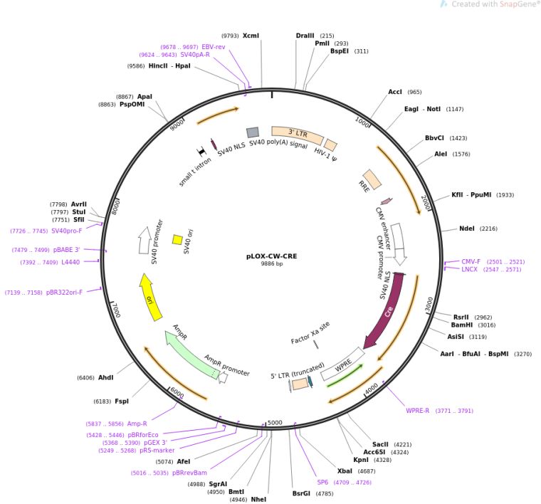 质粒名称:pLOX-CW-CRE 质粒编号:12238 载体名称:pHR 载体大小:9886 载体类型:Mammalian Expression, Lentiviral, Cre/Lox 原核抗性:氨苄青霉素,100μg/mL 培养温度:37℃ 克隆菌株:Stbl3 高拷贝/低拷贝:高拷贝 插入基因:CRE 基因突变:CMV promoter is upstream of nls-CRE. LoxP in 3' LTR. 克隆方法:限制性内切酶 5'测序引物:CMV forward 3'测序引物:SP6 for lox site 质粒图谱: