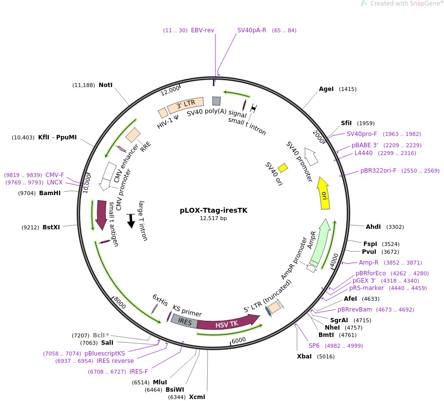 质粒名称:pLOX-Ttag-iresTK 质粒编号:12246 载体名称:pHR' 载体大小:12290 载体类型:Mammalian Expression, Lentiviral, Cre/Lox 原核抗性:氨苄青霉素,100μg/mL 培养温度:37℃ 克隆菌株:Stbl3 高拷贝/低拷贝:高拷贝 插入基因:SV40 Large T, HSV1-TK 基因别名:SV40 Large T 基因别名:HSV-1 thymidine kinase 物种来源:Simian virus 基因突变:LoxP in 3' LTR. 基因名称:SV40gp6 (a.k.a. SV40gp6) 克隆方法:限制性内切酶 5'测序引物:CMV Fwd for LargeT 3'测序引物:SP6 primer rev for LoxP 质粒图谱: