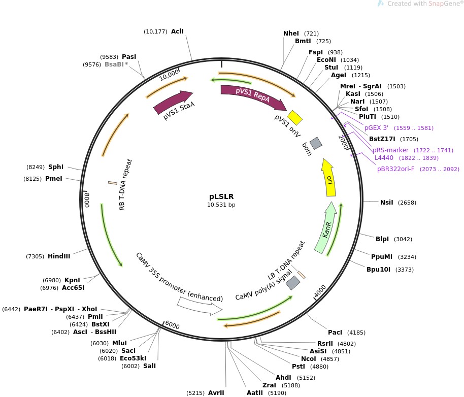 质粒名称:pLSLR 质粒编号:51500 质粒备注: (Empty Backbone) Single component plant T-DNA plasmid. Contains cis- and trans-acting replicational elements from the bean yellow dwarf virus in an LIR-SIR-Rep/RepA-LIR orientation. 载体名称:pCAMBIA1300 载体大小:10531 载体类型:plant T-DNA plasmid 筛选标记:潮霉素 原核抗性:卡那霉素,50μg/mL 培养温度:37℃ 克隆菌株:DH5alpha 高拷贝/低拷贝:高拷贝 克隆方法:限制性内切酶 5'测序引物:tcccactgacttgaagtacac 3'测序引物:ggacttgtttagagtttcta 质粒图谱: