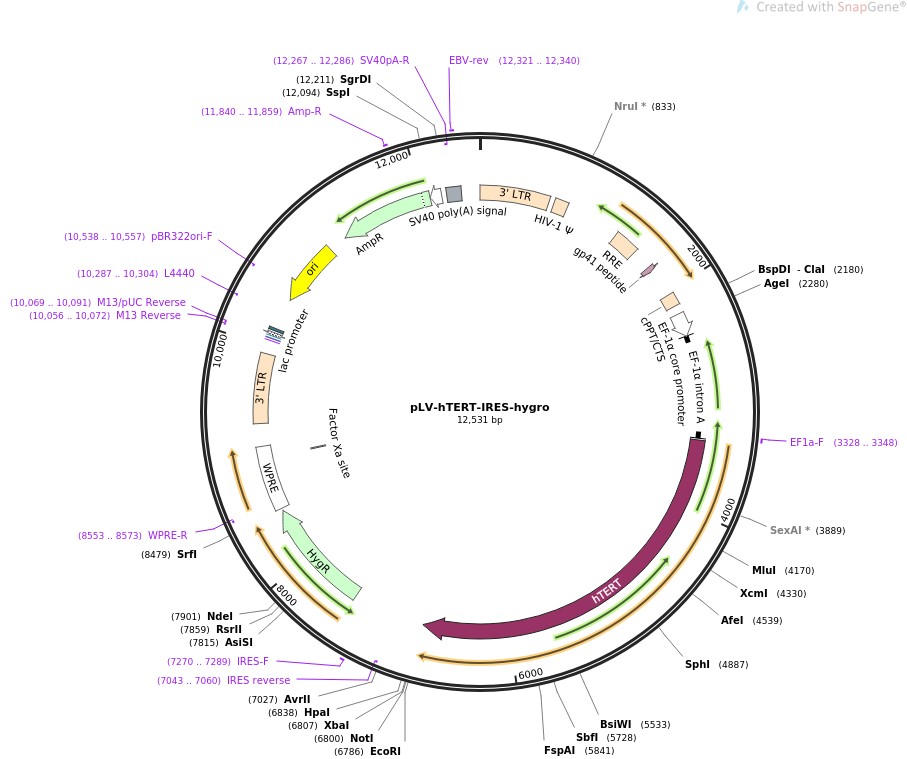 质粒名称:pLV-hTERT-IRES-hygro 质粒编号:85140 质粒备注: Lentiviral expression of hTERT, used to create immortalized cell lines 载体名称:pLV-EF1a-IRES-Hygro 载体大小:9211 完整质粒大小:12578 载体类型:慢病毒 筛选标记:潮霉素 原核抗性:氨苄青霉素,100μg/mL 培养温度:30℃ 克隆菌株:NEB Stable 高拷贝/低拷贝:高拷贝 插入基因:hTERT 基因别名:TERT 物种来源:H. sapiens (human) 插入大小:3399 基因名称:TERT (a.k.a. CMM9, DKCA2, DKCB4, EST2, PFBMFT1, TCS1, TP2, TRT, hEST2, hTRT) 启动子:EF1a 克隆方法:Gibson Cloning 5'测序引物:TCAAGCCTCAGACAGTGGTTC 3'测序引物:ACACCGGCCTTATTCCAA 质粒图谱: