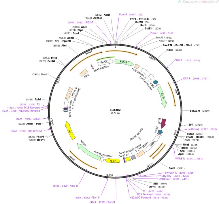 质粒名称:pLX302 质粒编号:25896 质粒备注: (Empty Backbone) 载体名称:pLKO 载体大小:9573 载体类型:Mammalian Expression, Lentiviral ; Gateway Destination vector 筛选标记:嘌呤霉素 原核抗性:Chloramphenicol and Ampicillin, 25 & 100 μg/mL 培养温度:30℃ 克隆菌株:ccdB Survival 高拷贝/低拷贝:低拷贝 插入基因:None 克隆方法:Gateway Cloning 5'测序引物:CMV-F 3'测序引物:WPRE-R 质粒图谱: