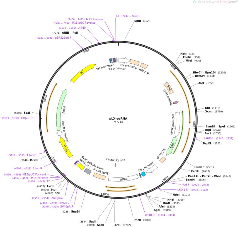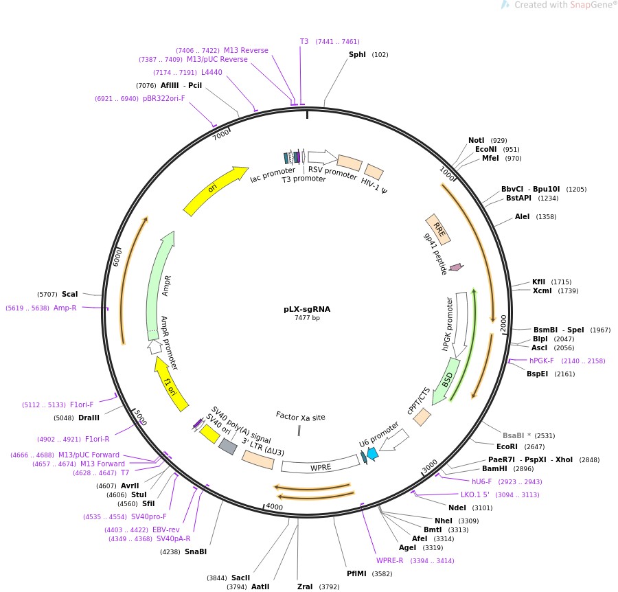 质粒名称:pLX-sgRNA 质粒编号:50662 质粒备注: Lentiviral expression of AAVS1-targeting sgRNA; insert can be replaced with custom sgRNA (see protocol) 载体名称:pLX304 载体大小:7000 完整质粒大小:7500 载体类型:哺乳动物表达,慢病毒,CRISPR 筛选标记:Blasticidin 原核抗性:氨苄青霉素,100μg/mL 培养温度:37℃ 克隆菌株:Stbl3 高拷贝/低拷贝:未知 插入基因:sgAAVS1 插入大小:450 启动子:U6 克隆方法:限制性内切酶 5'克隆位点:XhoI (not destroyed) 3'克隆位点:NheI (not destroyed) 5'测序引物:cgggtttattacagggacagcag 3'测序引物:taccagtcaatctttcacaaattttgt 质粒图谱: