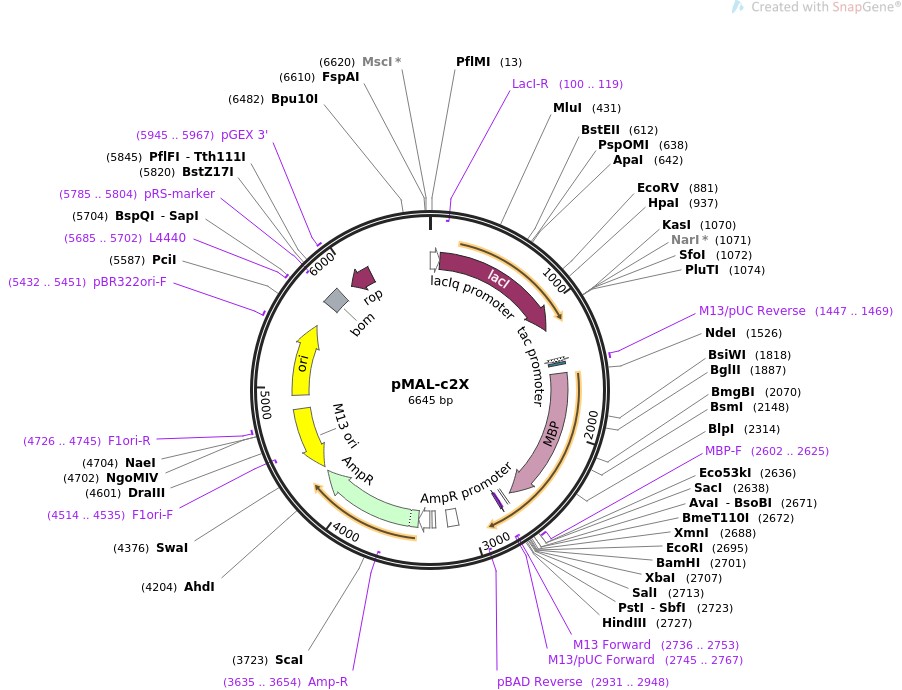 质粒名称:pMAL-c2X 质粒编号:75286 质粒备注: (Empty Backbone) Expresses proteins in the cytoplasm as fusions to maltose-binding protein 载体名称:pMAL-c2X 载体大小:6645 载体类型:原核表达 原核抗性:氨苄青霉素,100μg/mL 培养温度:37℃ 克隆菌株:DH5alpha 高拷贝/低拷贝:低拷贝 启动子:tac 克隆方法:限制性内切酶 5'测序引物:GGTCGTCAGACTGTCGATGAAGCC 3'测序引物:CGCCAGGGTTTTCCCAGTCACGAC 质粒图谱: