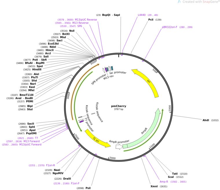 质粒名称:pmCherry 质粒编号:165828 质粒备注: mCherry red fluorescent protein CDS 载体名称:pUPD 载体大小:3057 载体类型:Insect Expression 原核抗性:氨苄青霉素,100μg/mL 培养温度:37℃ 克隆菌株:DH10B 高拷贝/低拷贝:高拷贝 插入基因:mCherry 物种来源:Synthetic 插入大小:711 克隆方法:限制性内切酶 5'克隆位点:Unknown (unknown if destroyed) 质粒图谱: