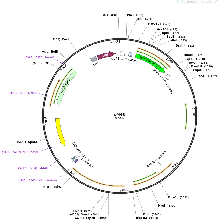 质粒名称:pMGU 质粒编号:139933 质粒备注: M. magneticum/E. coli shuttle vector (pMGT and pUC) 载体名称:pMGU 载体类型:原核表达 原核抗性:卡那霉素,50μg/mL 培养温度:37℃ 克隆菌株:DH5alpha 高拷贝/低拷贝:高拷贝 插入基因:sfGFP 物种来源:Synthetic 启动子:PJ23101 克隆方法:Gibson Cloning 质粒图谱: