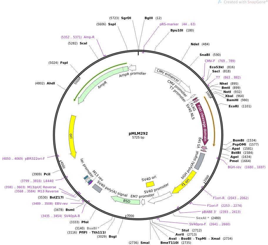 质粒名称:pMLM292 质粒编号:21873 质粒备注: (Empty Backbone) 载体名称:pMLM292 载体大小:5725 载体类型:Mammalian Expression ; zebrafish expression 原核抗性:氨苄青霉素,100μg/mL 培养温度:37℃ 克隆菌株:DH5alpha 高拷贝/低拷贝:高拷贝 插入基因:None 克隆方法:限制性内切酶 5'克隆位点:XbaI (not destroyed) 3'克隆位点:BamHI (not destroyed) 5'测序引物:CMV-F 质粒图谱: