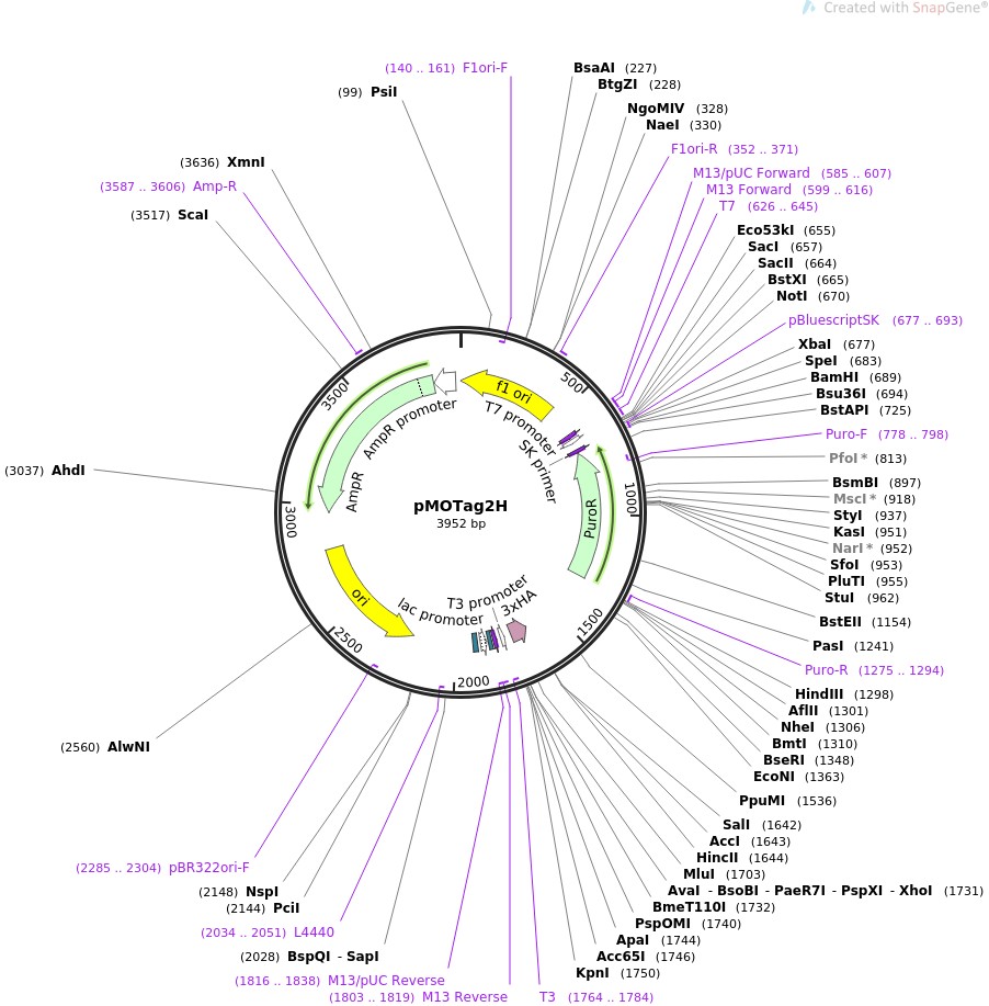 质粒名称:pMOTag2H 质粒编号:26296 质粒备注: (Empty Backbone) 载体名称:pBluescript II KS+ 载体大小:3952 载体类型:Trypanosome in-situ tagging vector 筛选标记:嘌呤霉素 原核抗性:氨苄青霉素,100μg/mL 培养温度:37℃ 克隆菌株:DH5alpha 高拷贝/低拷贝:未知 插入基因:None 克隆方法:限制性内切酶 5'测序引物:n/a 质粒图谱: