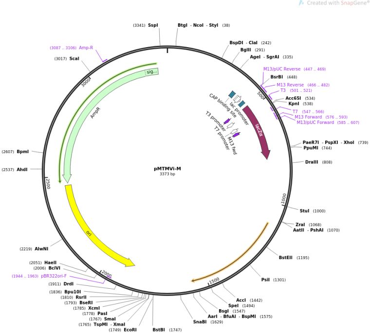 质粒名称:pMTMVi-M 质粒编号:118757 质粒备注: Intermediate plasmid to build tobacco mosaic virus recombinant clones that move systemically throughout the plant 载体名称:pUC18 完整质粒大小:3373 载体类型:Intermediate to build tobacco mosaic virus recombinant clones 原核抗性:氨苄青霉素,100μg/mL 培养温度:37℃ 克隆菌株:DH5alpha 高拷贝/低拷贝:高拷贝 插入基因:Tobacco mosaic virus cDNA fragment with a cloning polylinker 物种来源:Tobacco mosaic virus 克隆方法:Gibson Cloning 5'测序引物:- 3'测序引物:- 质粒图谱: