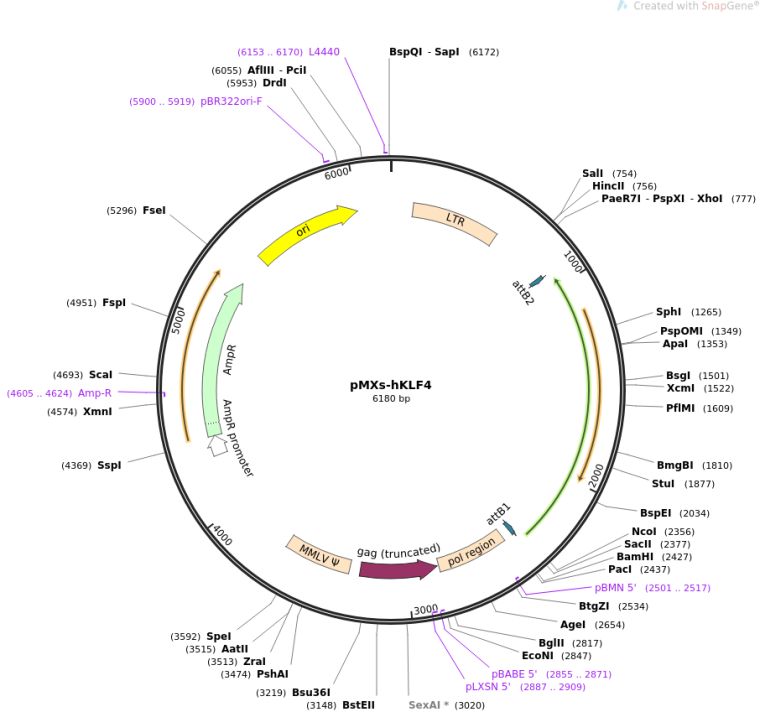 质粒名称:pMXs-hKLF4 质粒编号:17219 质粒备注: Retroviral expression of human KLF4 载体名称:pMXs 载体大小:4600 载体类型:哺乳动物表达,逆转录 原核抗性:氨苄青霉素,100μg/mL 培养温度:37℃ 克隆菌株:DH5alpha 高拷贝/低拷贝:高拷贝 插入基因:KLF4 物种来源:H. sapiens (human) 基因突变:None 插入大小:1420 基因名称:KLF4 (a.k.a. EZF, GKLF) 克隆方法:限制性内切酶 5'克隆位点:attB1 (not destroyed) 3'克隆位点:attB2 (not destroyed) 5'测序引物:pMX-S1811 质粒图谱: