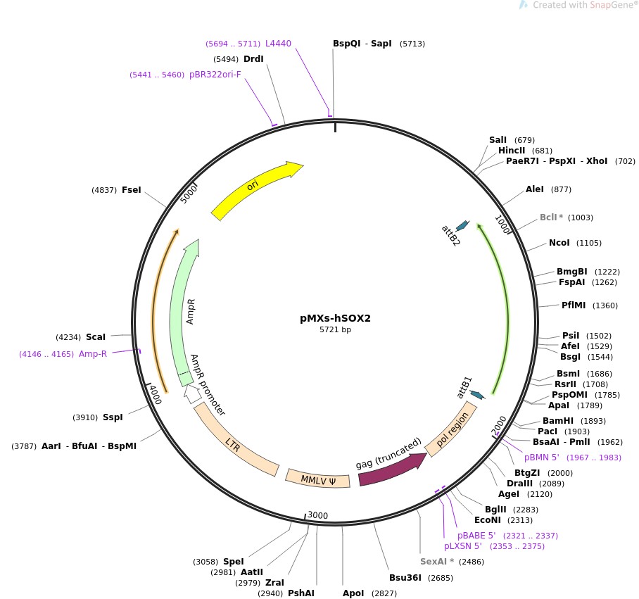 质粒名称:pMXs-hSOX2 质粒编号:17218 质粒备注: Retroviral expression of human SOX2 载体名称:pMXs 载体大小:4600 载体类型:哺乳动物表达,逆转录 原核抗性:氨苄青霉素,100μg/mL 培养温度:37℃ 克隆菌株:DH5alpha 高拷贝/低拷贝:高拷贝 插入基因:SOX2 物种来源:H. sapiens (human) 基因突变:None 插入大小:960 基因名称:SOX2 (a.k.a. ANOP3, MCOPS3) 克隆方法:限制性内切酶 5'克隆位点:attB1 (not destroyed) 3'克隆位点:attB2 (not destroyed) 5'测序引物:pMX-S1811 质粒图谱: