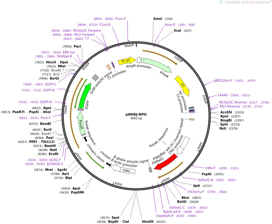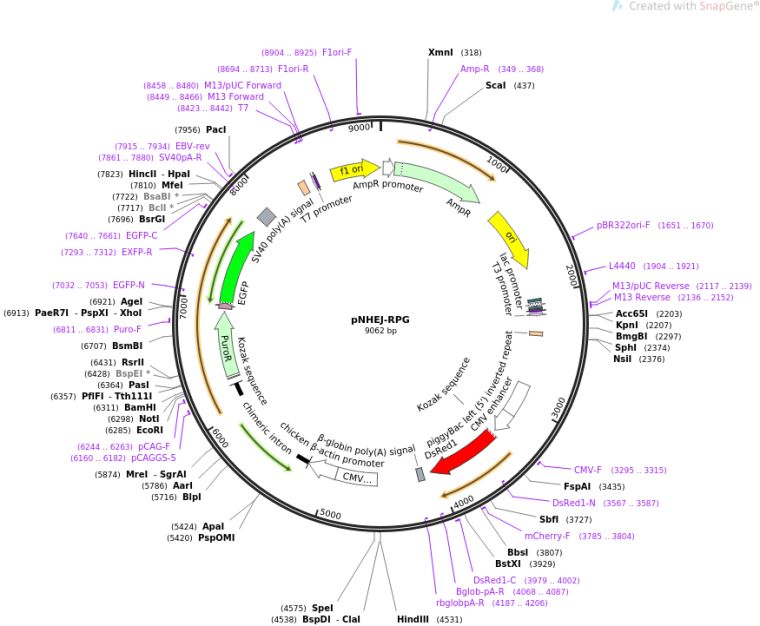 质粒名称:pNHEJ-RPG 质粒编号:85931 质粒备注: Constitutively express DsRed and conditionally express Puro and EGFP. Used to test transfection efficiency and enrich genetically modified cells 载体名称:pXL-Bac II 载体类型:Mammalian Expression ; dual-reporter surrogate 筛选标记:嘌呤霉素 原核抗性:氨苄青霉素,100μg/mL 培养温度:37℃ 克隆菌株:DH5alpha 高拷贝/低拷贝:高拷贝 插入基因:pPB-CMV-DsRed-polyA-CAG-NHEJ. Puro-T2A-EGFP 基因别名:DsRed, CAG-NHEJ. Puro-T2A-EGFP 克隆方法:未知 5'测序引物:pCAG-F (5'-GCAACGTGCTGGTTATTGTG-3') 3'测序引物:SV40pA-R 质粒图谱: