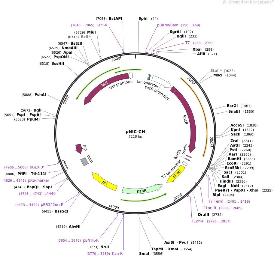质粒名称:pNIC-CH 质粒编号:26117 质粒备注: (Empty Backbone) SGC Empty backbone for bacterial expression 载体名称:pNIC-CH 载体大小:7218 载体类型:原核表达 原核抗性:卡那霉素,50μg/mL 培养温度:37℃ 克隆菌株:DH5alpha 高拷贝/低拷贝:低拷贝 启动子:T7-lacO 5'测序引物:T7 3'测序引物:T7-term 质粒图谱: