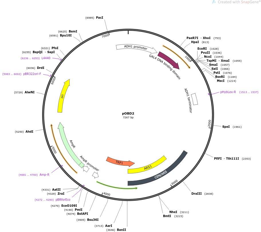 质粒名称:pOBD2 质粒编号:196826 质粒备注: (Empty Backbone) Yeast two-hybrid ; Gal4 DNA binding domain 载体名称:YCplac22 载体大小:7167 载体类型:酵母表达 筛选标记:TRP1 原核抗性:氨苄青霉素,100μg/mL 培养温度:37℃ 克隆菌株:DH5alpha 高拷贝/低拷贝:未知 启动子:ADH 质粒图谱: