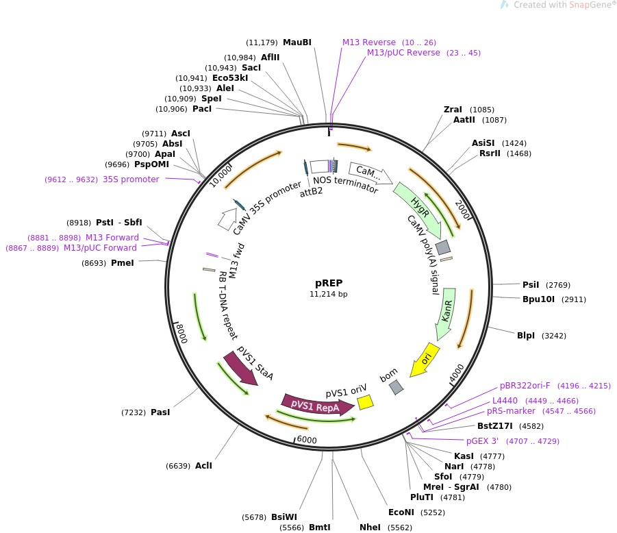 质粒名称:pREP 质粒编号:51491 质粒备注: pMDC32 with Rep/RepA coding sequence from the mild bean yellow dwarf virus 载体名称:pMDC32 载体大小:10000 完整质粒大小:11216 载体类型:plant expression T-DNA 筛选标记:潮霉素 原核抗性:卡那霉素,50μg/mL 培养温度:37℃ 克隆菌株:DH5alpha 高拷贝/低拷贝:高拷贝 插入基因:Rep/RepA 物种来源:bean yellow dwarf virus 基因突变:none 插入大小:1000 启动子:2x35S 克隆方法:Gateway Cloning 5'测序引物:atgccttctgctagtaagaactt 3'测序引物:aggcacgttcagtgactcga 质粒图谱: