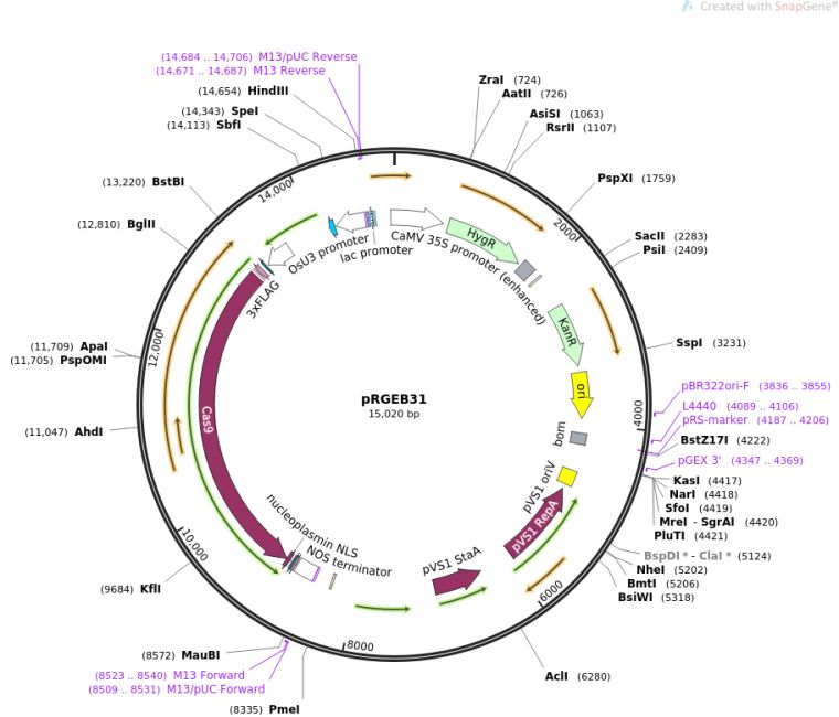 质粒名称:pRGEB31 质粒编号:51295 质粒备注: (Empty Backbone) Binary vector derived from pRGE31. Deliver sgRNA and Cas9 into plant. by agrobacterium mediated transformation. 载体名称:pCAMBIA1300 载体大小:8958 载体类型:Plant Expression, CRISPR ; plant expression 筛选标记:潮霉素 原核抗性:卡那霉素,50μg/mL 培养温度:37℃ 克隆菌株:DH5alpha 高拷贝/低拷贝:高拷贝 启动子:Rice snoRNA U3 and dual 35S promoter 克隆方法:限制性内切酶 5'测序引物:M13R(-48) 3'测序引物:M13F(-20) 质粒图谱: