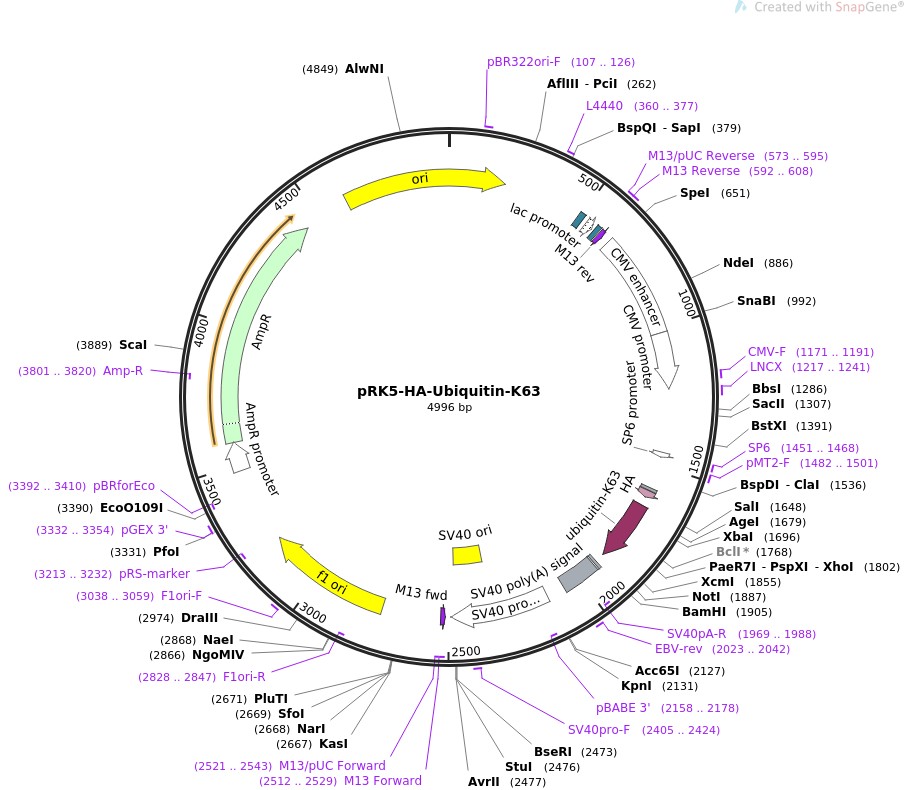 质粒名称:pRK5-HA-Ubiquitin-K63 质粒编号:17606 质粒备注: Mammalian expression of HA tagged ubiquitin with K63 only, other lysines mutated to arginines 载体名称:pRK5-HA 载体大小:4800 载体类型:哺乳动物表达 原核抗性:氨苄青霉素,100μg/mL 培养温度:37℃ 克隆菌株:DH5alpha 高拷贝/低拷贝:高拷贝 插入基因:Ubiquitin C 基因别名:Ub 物种来源:H. sapiens (human) 基因突变:K63 only, other lysines mutated to arginines. Enhances G76-K63-linked polyubiquitination. 插入大小:220 基因名称:UBC (a.k.a. HMG20) 克隆方法:限制性内切酶 5'克隆位点:SalI (not destroyed) 3'克隆位点:NotI (not destroyed) 5'测序引物:SP6 质粒图谱: