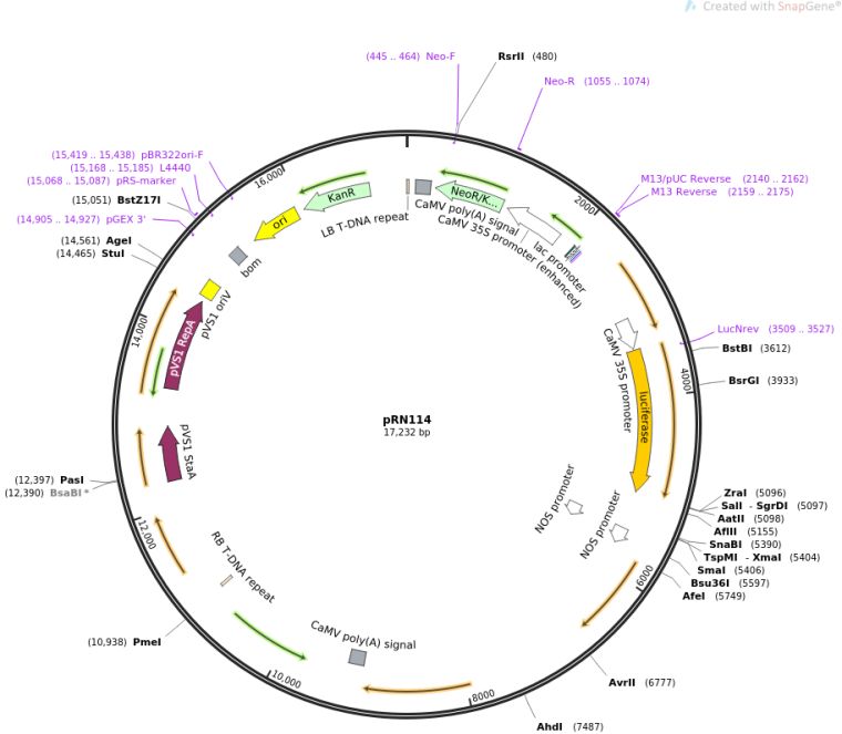 质粒名称:pRN114 质粒编号:127221 质粒备注: BeYDV replicon with constitutive Luc expression, WUS2 and AtSTM 载体名称:pTRANS_201 载体类型:Plant Expression 原核抗性:卡那霉素,50μg/mL 培养温度:37℃ 克隆菌株:DH5alpha 高拷贝/低拷贝:高拷贝 插入基因:Luc, Wus, AtSTM 物种来源:Firefly, Maize, Arabidopsis 基因突变:codon optimized CDSs 克隆方法:限制性内切酶 5'克隆位点:unknown (unknown if destroyed) 3'克隆位点:unknown (unknown if destroyed) 质粒图谱:
