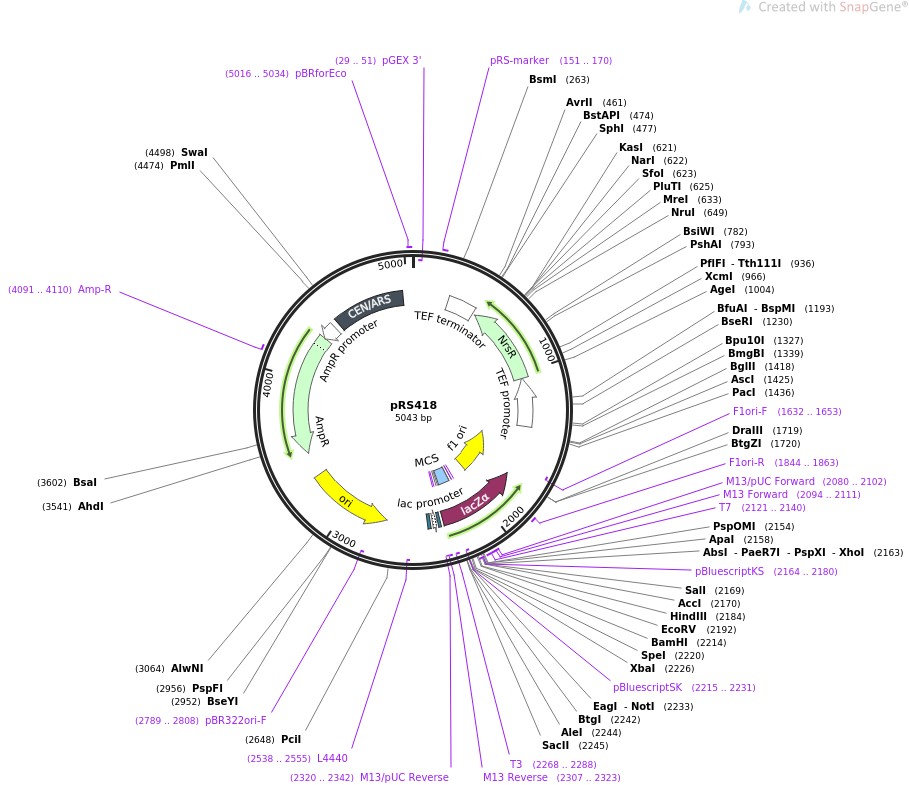 质粒名称:pRS418 质粒编号:11256 质粒备注: (Empty Backbone) 载体名称:pRS418 载体大小:5043 载体类型:酵母表达 筛选标记:NatMX 原核抗性:氨苄青霉素,100μg/mL 培养温度:37℃ 克隆菌株:DH5alpha 高拷贝/低拷贝:高拷贝 插入基因:None 克隆方法:限制性内切酶 5'测序引物:T7 3'测序引物:M13R 质粒图谱:
