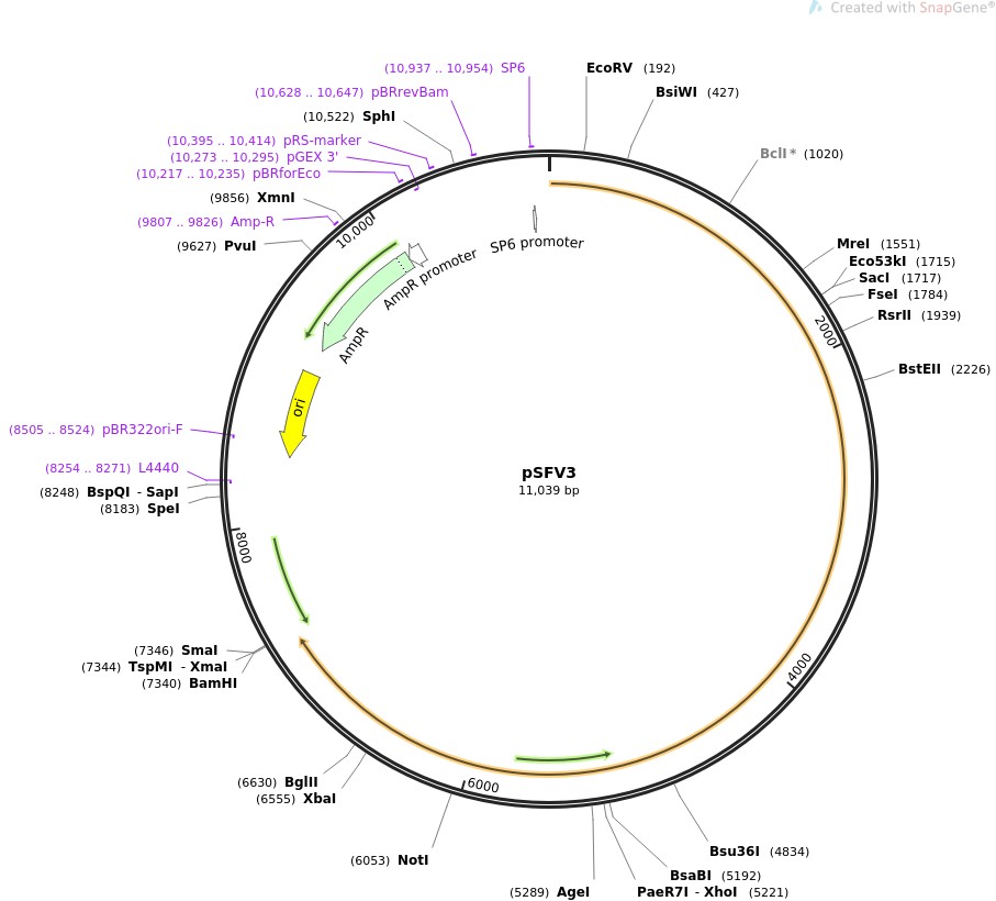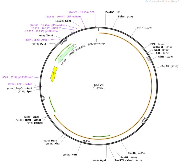 质粒名称:pSFV3 质粒编号:92072 质粒备注: (Empty Backbone) Empty expression plasmid for production of recombinant genomic SFV RNA. Co-transfection with RNA from pSFV-Helper1 or pSFV-Helper2 will produce recombinant virus like particles. 载体名称:pSP6-SFV4 载体类型:Empty expression plasmid, for run-off transcription and RNA transfection of mammalian cells 原核抗性:氨苄青霉素,100μg/mL 培养温度:37℃ 克隆菌株:DH5alpha 高拷贝/低拷贝:未知 质粒图谱: