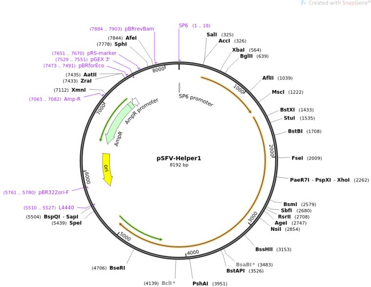 质粒名称:pSFV-Helper1 质粒编号:92073 质粒备注: This is a plasmid for transcription of defective helper RNA, providing structural Semliki forest virus (SFV) proteins to package recombinant SFV genomes into virus like particles. 载体名称:pGEM1 载体大小:2833 完整质粒大小:8194 载体类型:Helper plasmid, for run-off transcription and RNA transfection of mammalian cells 原核抗性:氨苄青霉素,100μg/mL 培养温度:37℃ 克隆菌株:DH5alpha 高拷贝/低拷贝:未知 插入基因:cDNA of SFV genome with deletion removing the nonstructural SFV proteins and also the viral RNA packaging signal. 插入大小:5361 质粒图谱: