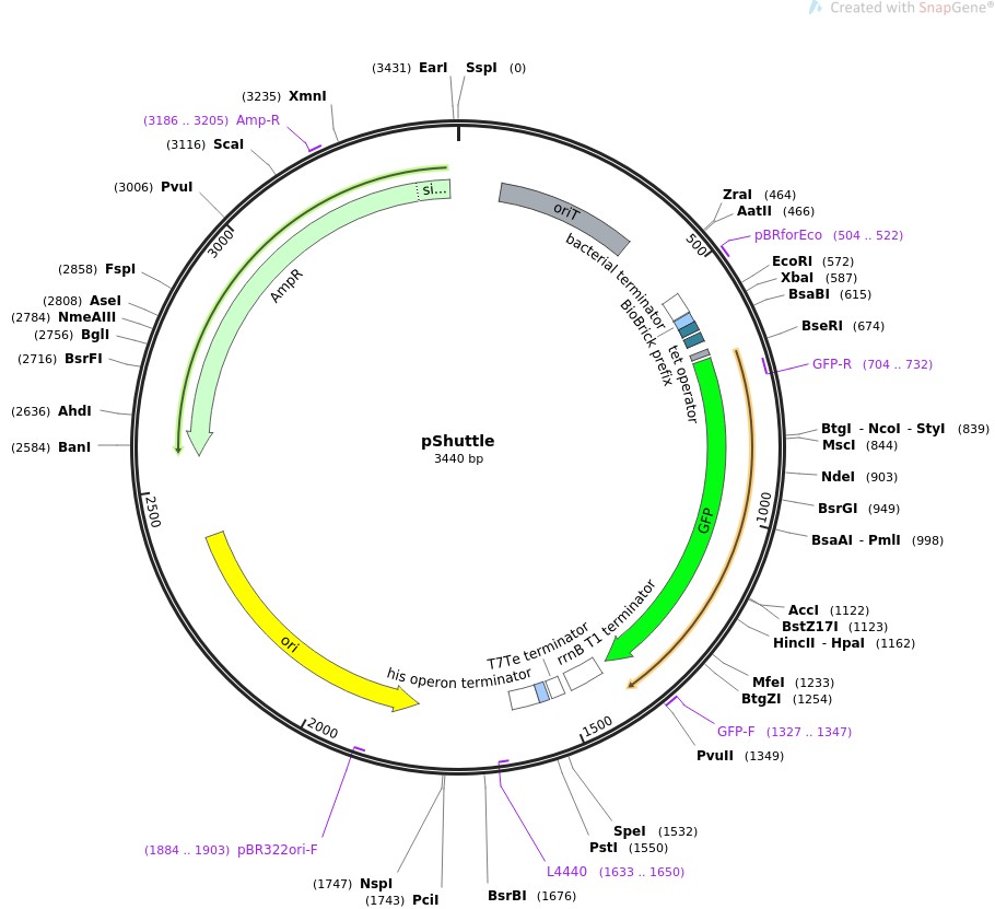 质粒名称:pShuttle 质粒编号:67964 质粒备注: Mobilizible plasmid with EGFP. OriT from the F plasmid. 载体名称:pSB1A3 载体类型:Synthetic Biology 原核抗性:氨苄青霉素,100μg/mL 培养温度:37℃ 克隆菌株:Top10 高拷贝/低拷贝:高拷贝 插入基因:OriT 物种来源:E. coli 克隆方法:限制性内切酶 5'克隆位点:SspI (destroyed during cloning) 3'克隆位点:AatII (not destroyed) 5'测序引物:ttgaatactcatactcttcc 3'测序引物:aattctgcctcgtgatacgcc 质粒图谱: