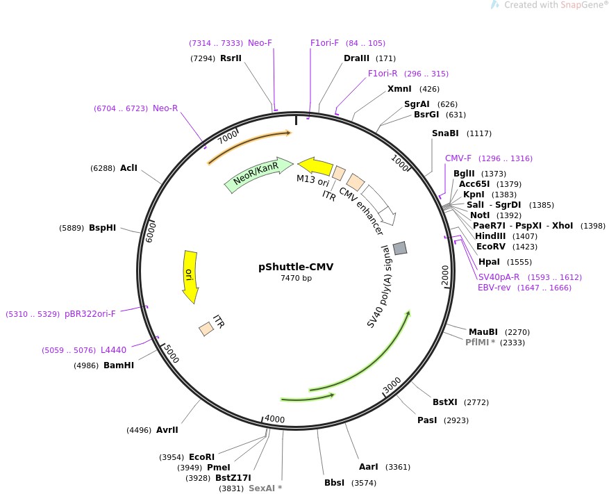 质粒名称:pShuttle-CMV 质粒编号:16403 质粒备注: (Empty Backbone) Shuttle vector for use in AdEasy System. Used for expression of transgenes under a CMV promoter when no GFP tracer is desired. 载体名称:pShuttle-CMV 载体大小:7452 载体类型:Mammalian Expression, Adenoviral 原核抗性:卡那霉素,50μg/mL 培养温度:37℃ 克隆菌株:DH10B 高拷贝/低拷贝:低拷贝 插入基因:None 克隆方法:限制性内切酶 5'测序引物:CMV-F 质粒图谱: