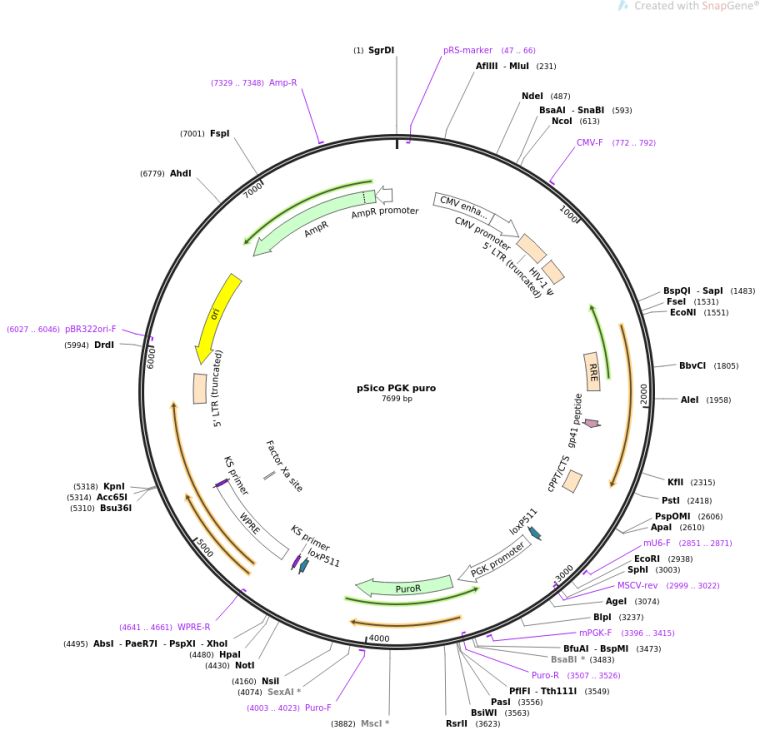 质粒名称:pSico PGK puro 质粒编号:11586 质粒备注: (Empty Backbone) 载体名称:pSico PGK puro 载体大小:7703 载体类型:Mammalian Expression, Lentiviral, RNAi, Cre/Lox 筛选标记:嘌呤霉素 原核抗性:氨苄青霉素,100μg/mL 培养温度:37℃ 克隆菌株:DH5alpha 高拷贝/低拷贝:高拷贝 插入基因:None 克隆方法:限制性内切酶 5'克隆位点:HpaI (not destroyed) 3'克隆位点:XhoI (not destroyed) 5'测序引物:n/a 质粒图谱: