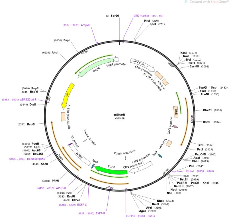 质粒名称:pSicoR 质粒编号:11579 质粒备注: (Empty Backbone) 载体名称:pSicoR 载体大小:7567 载体类型:Mammalian Expression, Lentiviral, RNAi, Cre/Lox 原核抗性:氨苄青霉素,100μg/mL 培养温度:37℃ 克隆菌株:NEB Stable 高拷贝/低拷贝:高拷贝 插入基因:None 克隆方法:限制性内切酶 5'克隆位点:HpaI (not destroyed) 3'克隆位点:XhoI (not destroyed) 5'测序引物:mU6-F (5'-ATATCCCTTGGAGAAAAGCCTT-3') 质粒图谱: