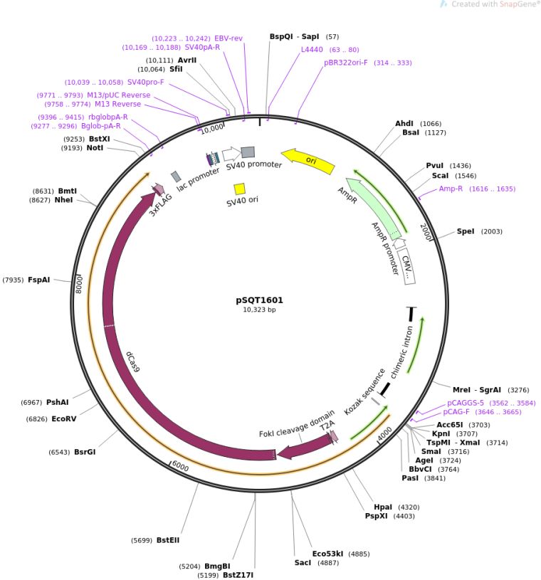 质粒名称:pSQT1601 质粒编号:53369 质粒备注: human codon optimized Csy4 and FokI-dCas9 expression plasmid 载体名称:pCAG-CFP 载体类型:哺乳动物表达,CRISPR 原核抗性:氨苄青霉素,100μg/mL 培养温度:37℃ 克隆菌株:XL1 Blue 高拷贝/低拷贝:高拷贝 插入基因:hCsy4-T2A-NLS-hFokI-dCas9-NLS 基因别名:Csy4 基因别名:FokI-dCas9 启动子:CAG 克隆方法:未知 5'测序引物:pCAG-F 3'测序引物:Bglob-pA-R 质粒图谱: