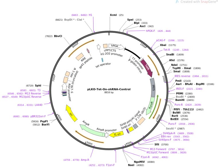 质粒名称:pLKO-Tet-On-shRNA-Control 质粒编号:98398 质粒备注: Lentivirus for expression of non-targeting control shRNA (Dox-inducible) 载体名称:Tet-pLKO-Puro (pLKO-Tet-On) Addgene #21915 载体大小:8758 完整质粒大小:8816 载体类型:慢病毒 筛选标记:嘌呤霉素 原核抗性:氨苄青霉素,100μg/mL 培养温度:30℃ 克隆菌株:NEB Stable 高拷贝/低拷贝:高拷贝 插入基因:non-targeting randomized sequence 物种来源:H. sapiens (human) 克隆方法:限制性内切酶 5'克隆位点:AgeI (destroyed during cloning) 3'克隆位点:EcoRI (destroyed during cloning) 5'测序引物:SHSEQ2 GGAAATCACCATAAACGTGA 质粒图谱: