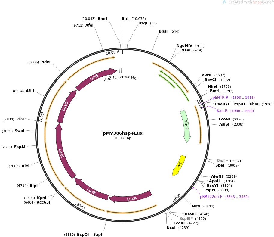 质粒名称:pMV306hsp+Lux 质粒编号:26159 载体名称:pMV306hsp 载体大小:4373 载体类型:原核表达 原核抗性:卡那霉素,50μg/mL 培养温度:37℃ 克隆菌株:DH5alpha 高拷贝/低拷贝:低拷贝 插入基因:Bacterial luciferase operon 基因别名:LuxABCDE 物种来源:Photorhabdus luminescens 基因突变:It contains a gram-positive enhanced translation signal in front of luxA, luxC and luxE 插入大小:5722 克隆方法:限制性内切酶 5'克隆位点:EcoRI (not destroyed) 3'克隆位点:EcoRV (destroyed during cloning) 5'测序引物:agaataacgttggcactcgc 质粒图谱: