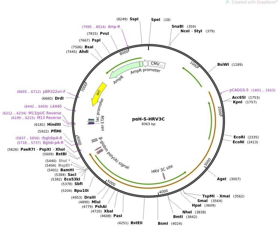 质粒名称:pαH-S-HRV3C 质粒编号:164567 质粒备注: SARS-CoV-2 Spike protein with furin site mutated to HRV3C site (S-HRV3C variant) 载体名称:pαH 载体大小:4746 完整质粒大小:8358 载体类型:哺乳动物表达 原核抗性:氨苄青霉素,100μg/mL 培养温度:37℃ 克隆菌株:DH5alpha 高拷贝/低拷贝:高拷贝 插入基因:Spike - Furin site changed for HRV3C site 基因别名:S-HRV3C 物种来源:Severe acute respiratory syndrome coronavirus 2 基因突变:682-685 (furin site) replaced with HRV3C site (LEVLFQGP) 插入大小:3636 标签/融合蛋白:· 8X His tag (C terminal on backbone) · 2X Strep-Tag II (C terminal on backbone) 质粒图谱: