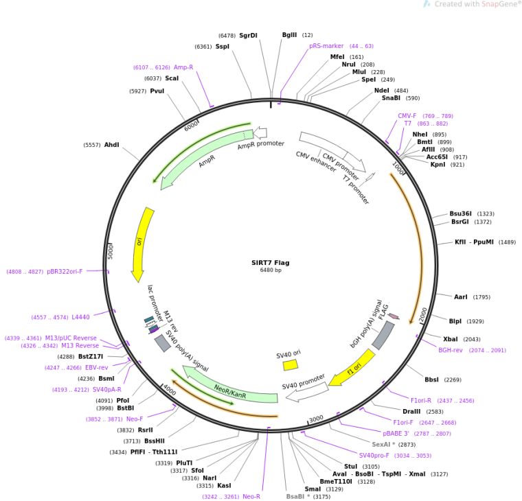 质粒名称:SIRT7 Flag 质粒编号:13818 质粒备注: Mammalian expression of human SIRT7 with flag tag 载体名称:pcDNA3.1 + 载体大小:5500 载体类型:哺乳动物表达 筛选标记:新霉素(G418) 原核抗性:氨苄青霉素,100μg/mL 培养温度:37℃ 克隆菌株:DH5alpha 高拷贝/低拷贝:高拷贝 插入基因:SIRT7 物种来源:H. sapiens (human) 基因突变:Missing exon 2 基因名称:SIRT7 (a.k.a. SIR2L7) 克隆方法:限制性内切酶 5'克隆位点:EcoRI (not destroyed) 3'克隆位点:EcoRI (not destroyed) 5'测序引物:T7 3'测序引物:BGH Reverse 质粒图谱: