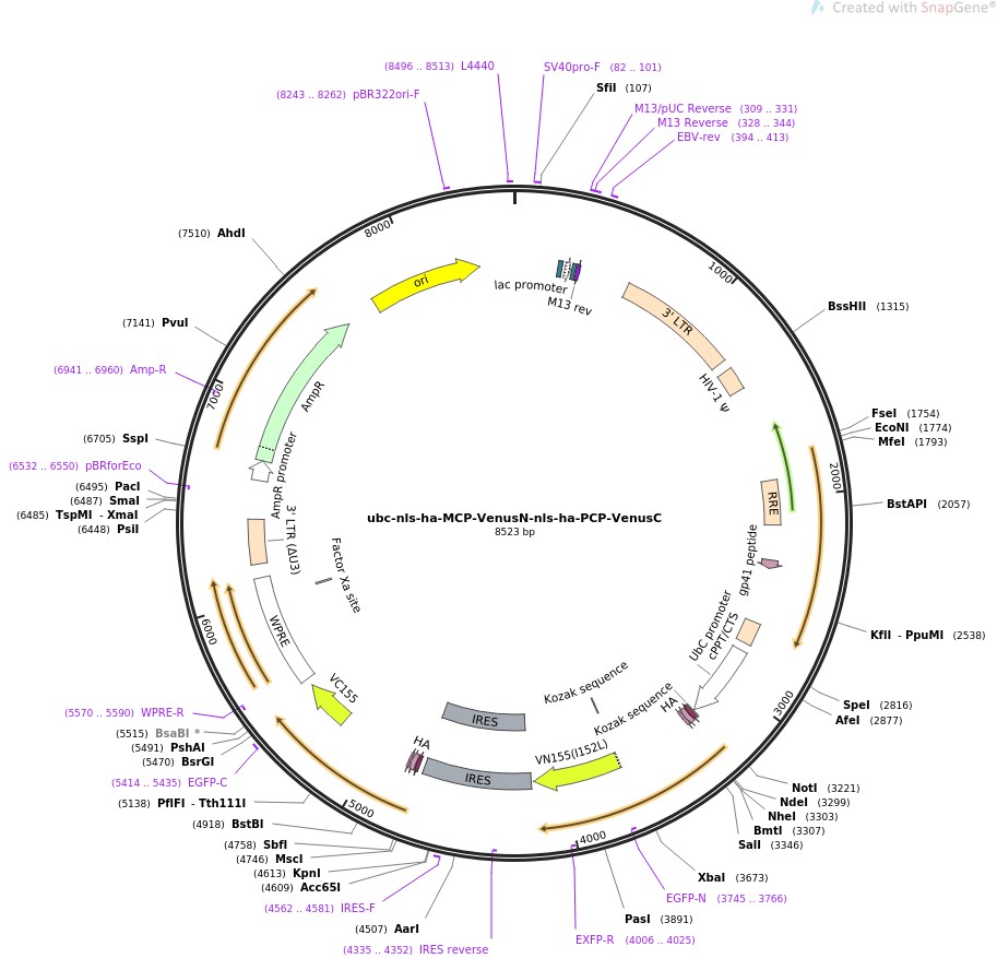 质粒名称:ubc-nls-ha-MCP-VenusN-nls-ha-PCP-VenusC 质粒编号:52985 质粒备注: split Venus attached to MCP and PCP respectively 载体名称:phage 载体大小:6200 完整质粒大小:8523 载体类型:慢病毒 原核抗性:氨苄青霉素,100μg/mL 培养温度:37℃ 克隆菌株:Stbl3 高拷贝/低拷贝:高拷贝 插入基因:nls-ha-MCP-VenusN-nls-ha-PCP-VenusC 物种来源:Synthetic 插入大小:2252 启动子:ubc 克隆方法:限制性内切酶 5'克隆位点:NotI (unknown if destroyed) 3'克隆位点:ClaI (unknown if destroyed) 5'测序引物:ubc (5'-CGC CGA TGA TTA TAT AAG GA-3') 3'测序引物:WPRE-R 质粒图谱: