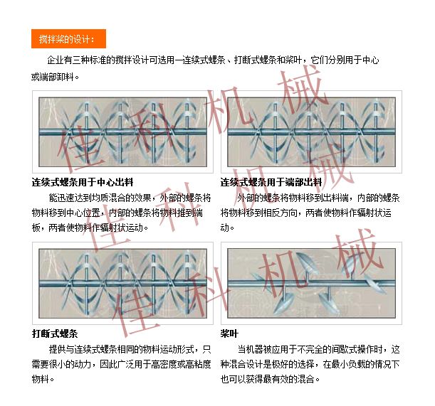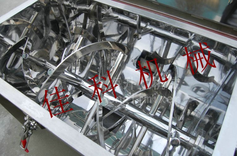 干粉颗粒高效混合机由混合仓、搅拌器、驱动装置基本组成,U型管状仓内安装双层异向螺带盘绕的搅拌器轴,外螺旋带在动力的驱动下,其盘绕形式配合旋转方向把物料从U型仓两端向中央地带推动,而内螺旋带把物料从中间向两端推动,形成对流混合。