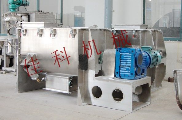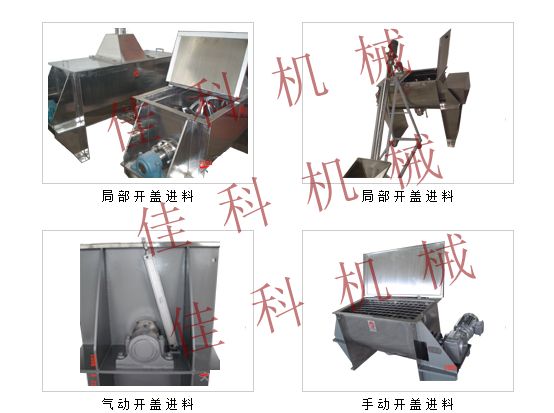调味料卧式混合机由混合仓、搅拌器、驱动装置基本组成,U型管状仓内安装双层异向螺带盘绕的搅拌器轴,外螺旋带在动力的驱动下,其盘绕形式配合旋转方向把物料从U型仓两端向中央地带推动,而内螺旋带把物料从中间向两端推动,形成对流混合。