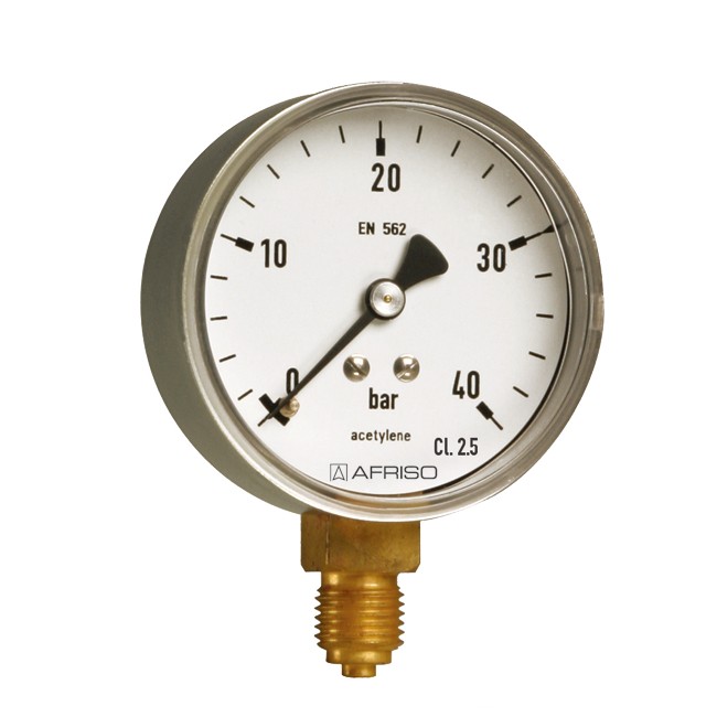| 适用于焊接,切割机器和系统及类似工艺过程。 | 型号 | D2/D3 | 公称直径 | 50 – 63 | 标准 | ISO 5171 | 精度等级( EN 837-1/6 ) | 2.5 | 量程( EN 837-1/5 ) | -1/0 bar到 -1/+15 bar 0/1 bar到 0/400 bar | 负载范围 | 静态负载:3/4 x满量程 动态负载:2/3 x满量程 瞬间负载:满量程 | 工作温度 | 介质温度: Tmax= +60 ℃ 环境温度: Tmin= -20 ℃; Tmax= +60 ℃ | 温度影响 | 如果测量元件的温度偏离+20℃,会产生一定偏差: 温度上升:约±0.4%/10K 温度下降:约±0.4%/10K 满量程的百分比值 | 防护等级 | IP 32(EN 60529) | 过程连接 | 铜合金,径向或中心轴向 压力输入口带限流 G1/4B–扳手尺寸SW14 ( EN 837-1/7.3 ) | 测量元件 | 弹簧管,铜合金 ≤ 40 bar “C”型管 > 40 bar螺旋管 (如测量介质是乙炔,铜含量<70%) | | 干净程度 | 与介质接触部件去油去油脂 | 机芯 | 铜合金 | 表牌 | 铝,白色 表牌印刷为黑色 | 指针 | 铝,黑色 | 表壳 | D2 –钢(金色或黑色喷塑) D3 -不锈钢304,卸压后盖 | 标记 | 氧气表,标记“Oxygen”和 “Free from oil and grease” 乙炔表,标记“Acetylene” | 视窗 | 塑料,按压式 | | 可选项 | ■氩气/CO2可以升为单位 ■特殊刻度 ■其他连接螺纹 |