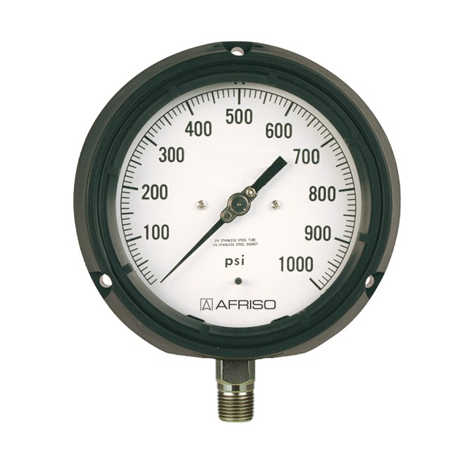 | 适用于测量低粘度、非结晶的腐蚀性气体或液体介质的压力。尤其适合石油石化工业。 | 型号 | D1 | 公称直径 | 4½” | 精度等级( EN 837-1/6 ) | 2A级ASME B 40.100 (相当于0.5级) | 量程( EN 837-1/5 ) | -1/0到 -1/+15 bar 0/0.6到 0/600 bar | 负载范围 | 静态负载:满量程 动态负载: 0.9 x满量程 瞬间负载: 1.3 x满量程 | 工作温度 | 介质温度: Tmax= +100 ℃ 环境温度: Tmin= -40℃; Tmax= +65 ℃ 充甘油型:-20/+65 ℃ | 温度影响 | 如果测量元件的温度偏离+20℃,会产生一定偏差: 温度上升:约±0.4%/10K 温度下降:约±0.4%/10K 满量程的百分比值 | 防护等级 | IP 45 (EN 60529) | 过程连接 | 不锈钢316L,径向或轴向偏心 1/2-14NPT–扳手尺寸SW22 | 测量元件 | 弹簧管,不锈钢316Ti/316L ≤ 60 bar “C”型管 >60 bar螺旋管 以氦气测漏 | 机芯 | 不锈钢 | 表牌 | 铝,白色 表牌印刷为黑色 | 指针 | 微调指针,铜合金,黑色 微调齿轮机构:铜合金,镀镍 | 表壳 | PP-GF20,黑色,带防护挡板和卸压后盖 配黑色法兰 | 螺旋式罩圈 | PP-GF20,黑色,内螺纹 | 视窗 | 塑料( PMMA) | | 可选项 | ■充甘油(D6型) ■充硅油(D6型)