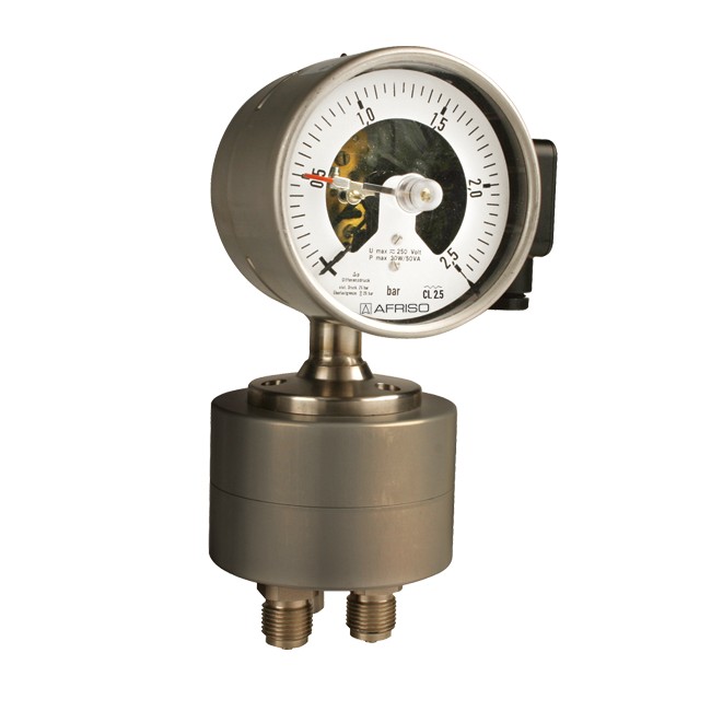 | 压力作用在被弹性膜片隔开的两个压力腔内。如果两压力腔的压力有差异,膜片顶着弹簧产生位移,这个位移通过传动杆传递给机芯。压差直接由指针指示。膜片由金属支撑着,所以两侧可过压到25 bar。 | 精度等级(EN 837-3/6) | 2.5级 | 量程( EN 837-3/5 ) | MF100:0/250 mbar到0/6 bar MFW100:0/250 mbar到 0/25 bar | 最大静态压力 | 25 bar | 过载压力 | 两侧最大可达25 bar | 工作温度