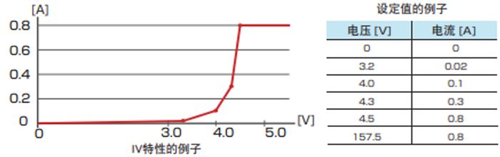 通过登记多个I-V特性上的任意点 (压值,电流值的组合)就可以设置非直线的负载特性。任意点可登记3点~100点。可用于LED负载的模拟等情况。由于输入电压可任意设置电流,因此可以实现以前所无法完成的应用,例如只能靠外加电压工作的开关等。