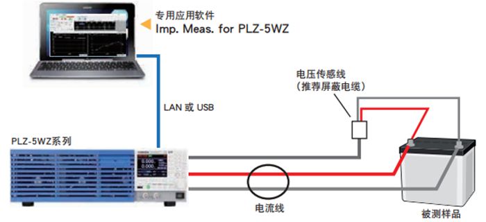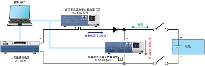 仅用大功率开关电源PAT-T系列不能进行高速工作,通过串联和并联连接电子负载装置PLZ-5W系列可形成高速响应的单极电源。由此便可在高速工作时实现对电池的图案化充电电流,放电电流的同步,并使电流流动。如果进一步在电池评测试验中使用PLZ-5WZ,即可在评测过程中无缝地测量电池的阻抗。