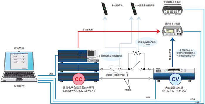在保险丝熔断试验中,直流电源的恒定电流工作需要高速电流控制。仅靠直流电源很难实现高速电流控制,但只要与电子负载装置PLZ-5W系列组合使用,即可实现高速电流控制。 保险丝熔断试验要求JASO D612标准。可进行标准要求的各种试验(电压下降试验,瞬变电流遮断试验,熔断时间试验,分步通电试验,遮断容量试验)。