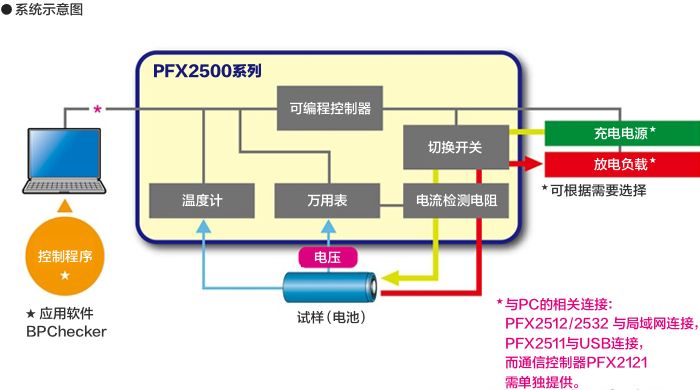 PFX2500系列是对电池等的充放电电压/电流进行高精度检测的充放电控制专用控制器。将电池评价所需的系统集中到一台设备之中,通过菊水公司的直流电源与电子负载装置的组合,可轻松搭建充放电试验系统。此外,通过使用专用的应用软件,可以实现对试验条件的设置〜执行〜试验结果分析的统一管理。无需繁琐的操作,以低成本搭建系统。对从基本测试到模拟的充放电检测提供全方位支持。 产品的特点与优势 将系统集中于一台设备之中/设置简单 将复杂的系统集中到一台设备之中。用户可自行设置。