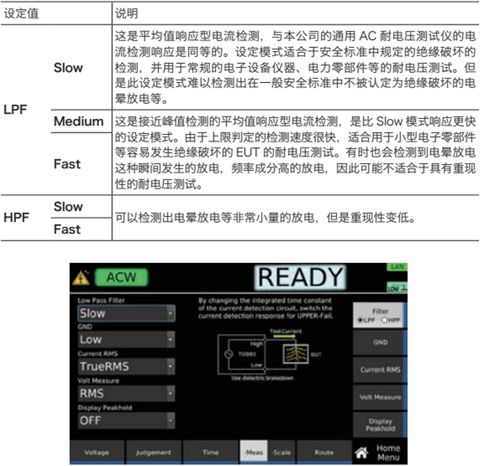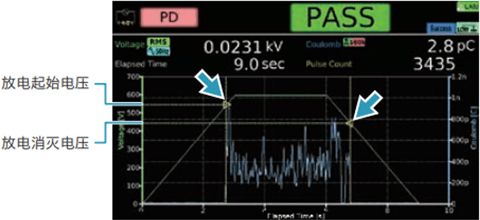 耐电压测试仪用于判定是否发生绝缘破坏的测试,因此基本上对于局部放电这种瞬间放电电流是不涵盖在其判定范围内的。但是为了满足要了解绝缘破坏的前兆的需求,在TOS9300系列中实现了5个级别的响应速度(灵敏度)的设定。通过设定还可以检测出传统的耐电压测试中无法检测到的小量放电。