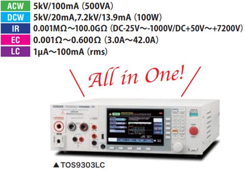 配备了AC/DC耐电压测试,绝缘电阻测试,AC/DC接地导通测试,泄漏电流测试的所有功能的TOS9303LC机型,可用1台完成电气安全标准的符合性测试。还可支持接触电流测试,保护导体电流测试,患者泄露电流测试。
