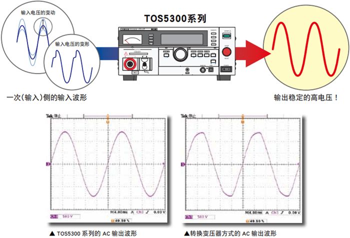 TOS5300系列是对电器产品必须进行安全确保4项测试中的耐电压测试,绝缘阻抗测试的测试仪器。输出为5kV/100mA(AC),6kV/10mA(DC),基于在IEC,EN,UL,VDE,JIS等各国安全规定或电器产品安全法的要求之上,可对电子器械,电子部品进行耐电压/绝缘阻抗测试。还有,采用了新研发的开关放大器,使测试电压的稳定性更高。因为不受AC输入端电压和频率变化的影响,可保持稳定的输出电压,所以在电源环境不稳定的区域也可进行稳定,安心的测试。同时还具备了可对应各式各样客户要求的各种功能。TOS5300系列是一款基于操作性・实用性・安全性为一体的机型。 产品的特点与优势以较稳定的输出完成AC耐电压测试![输入电压变动率 ±0.3%]在耐电压测试中,输出波形是重要的规格! 一般的耐电压测试仪是针对AC线路的输入电压转换变压器升压后进行输出。采用这种转换变压器方式时,输入电压的变动会影响到输出,有时可能无法正确完成测试。甚至当变形的电压施加到被测试装置后,也可能会形成新产品不良的原因(加速部件的劣化)。TOS5300系列产品内置由高效率PWM放大器,不会受到AC线路变动的影响,能够输出稳定的高电压,即使在电压变动大的地区,也可以放心,稳定的实现可靠性高的安全测试。
