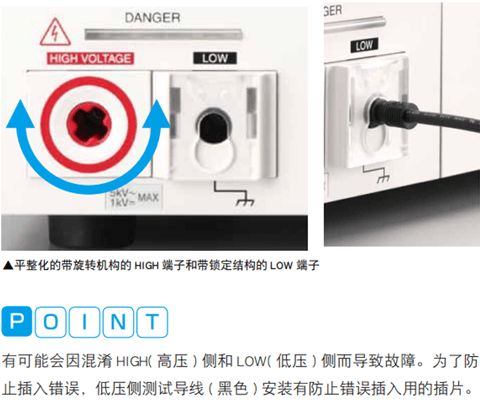 考虑到实际使用的现场环境及操作员的安全,将HIGH侧输出端子配置在离操作部最远的位置。采用旋转机构防止发生电缆的扭转(短线)。一侧的LOW端子也通过在本体侧配置锁定结构,去除了LOW侧测试导线的五金具,使测试导线不容易受到损伤。当消除了这些输出端子的突起部后,可以防止因移动等情况下不小心发生的损坏。另外,被测试体和连接电缆被卡住或被施加了额外的外力时,从设计结构上来讲,HIGH(高压)侧端子易于脱落,而LOW(接地)侧端子则不易脱落。 防止误插入对策也很完善为了防止插入错误,不仅采用了HIGH(红色),LOW(黑色)的颜色进行区分。端子形状也不相同。